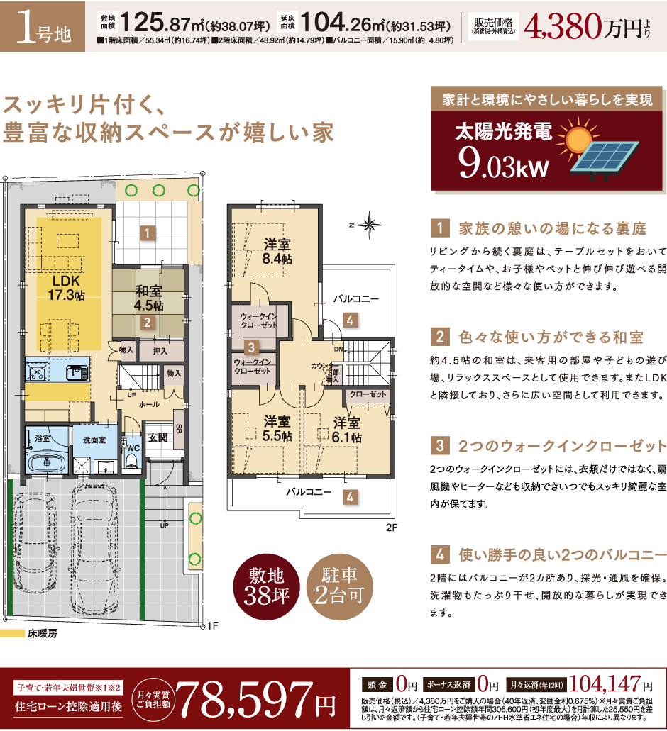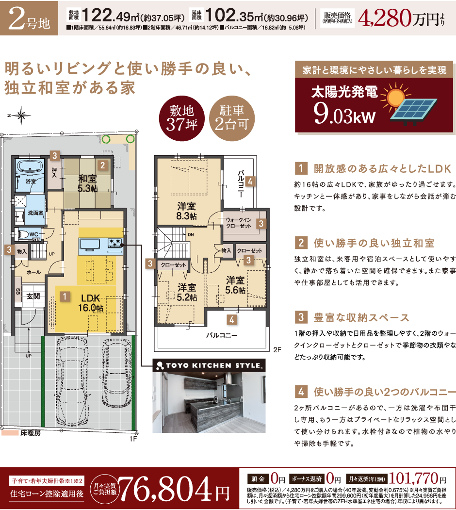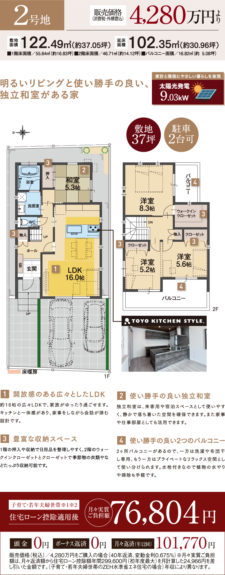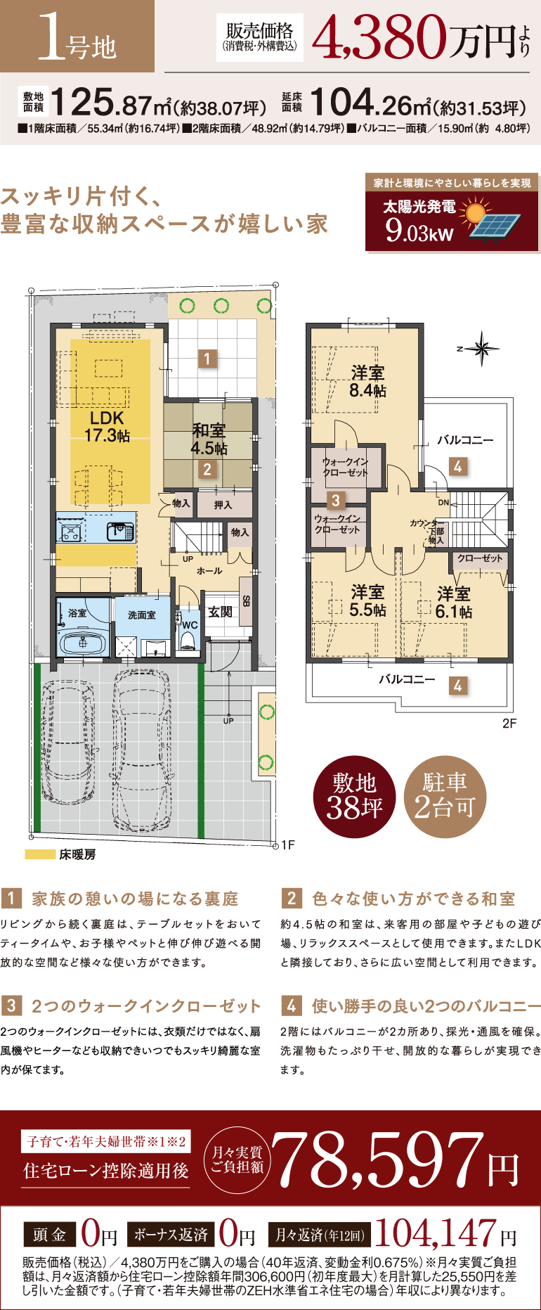 - 全区画ZEH住宅仕様。高断熱・省エネ・創エネで光熱費を抑え、快適で環境にもやさしい暮らしを実現します。