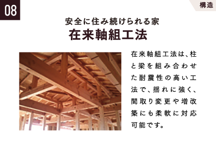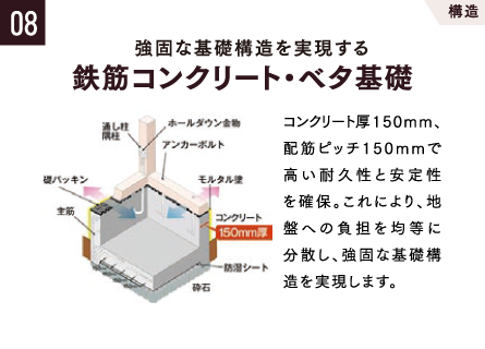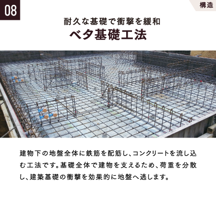 「耐震等級」は、建物が地震にどれだけ強いかを示す指標です。フクダ不動産では、最高等級である「耐震等級3」を標準仕様として採用。「耐震構造」とは、建物を強固に支え、揺れに耐える設計のこと。建物の倒壊を防ぎ、安全性を高めます。