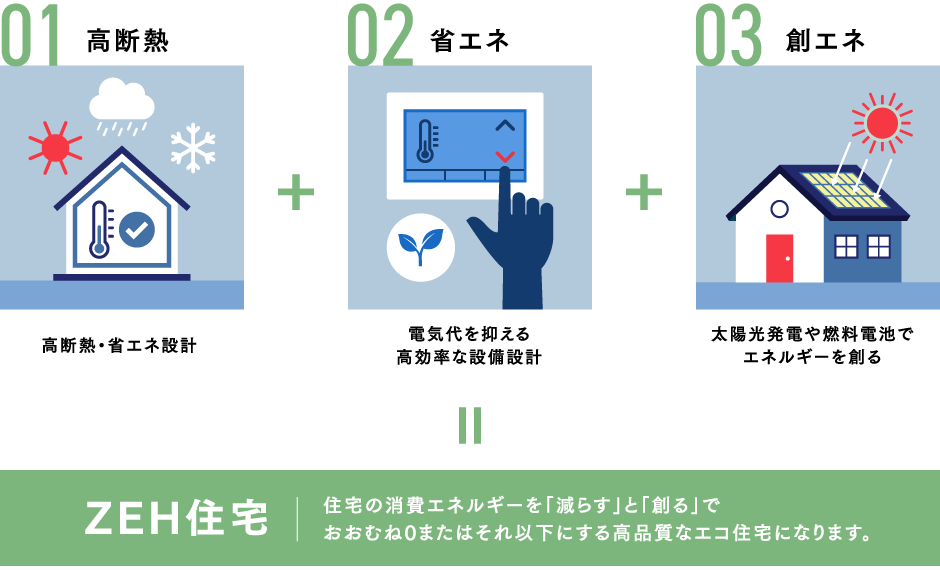 ZEH(ネット・ゼロ・エネルギー・ハウス)は、高断熱・省エネ設備・太陽光発電を活用し、